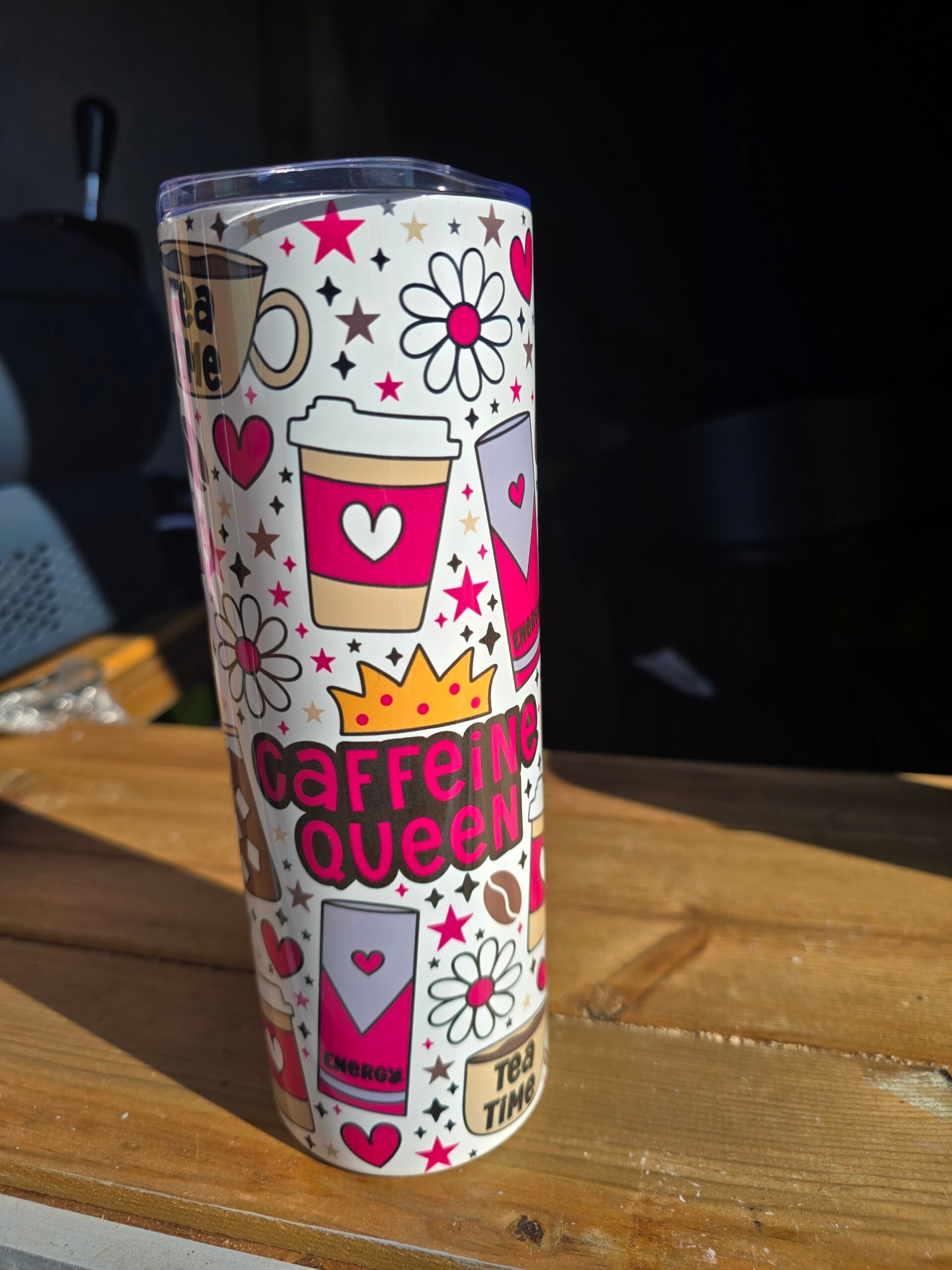 Fuel your day in style with our vibrant Caffeine Queen Skinny Tumbler – the perfect companion for coffee lovers, tea sippers, and energy drink devotees alike!