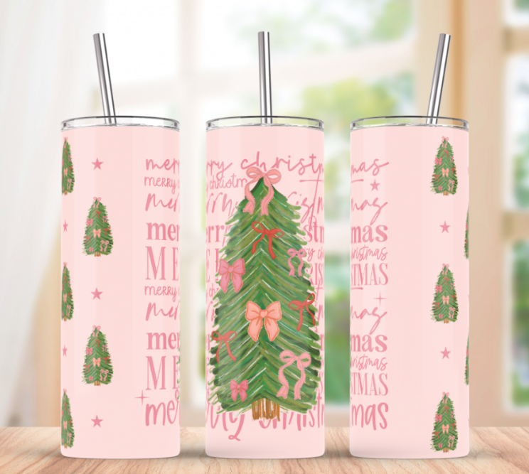 Bring festive cheer to your sips this holiday season with our beautifully designed 20 oz skinny tumbler. Featuring a soft pink background, elegant Christmas trees, and delicate bows, this tumbler is perfect for adding a touch of seasonal magic to your everyday routine.